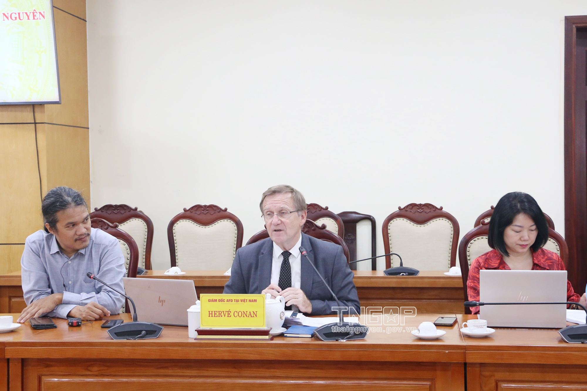 On the morning of July 24, Comrade Nguyen Linh, Vice Chairman of the Provincial People's Committee, chaired a working session with a delegation from the French Development Agency (AFD) in Vietnam, led by Mr. Hervé Conan, Country Director of AFD in Vietnam, regarding the Project on Embankment Construction for Landslide Prevention, Climate Change Adaptation, Livelihood Protection and Agricultural Production Support in Bac Kan province (now Thai Nguyen province).