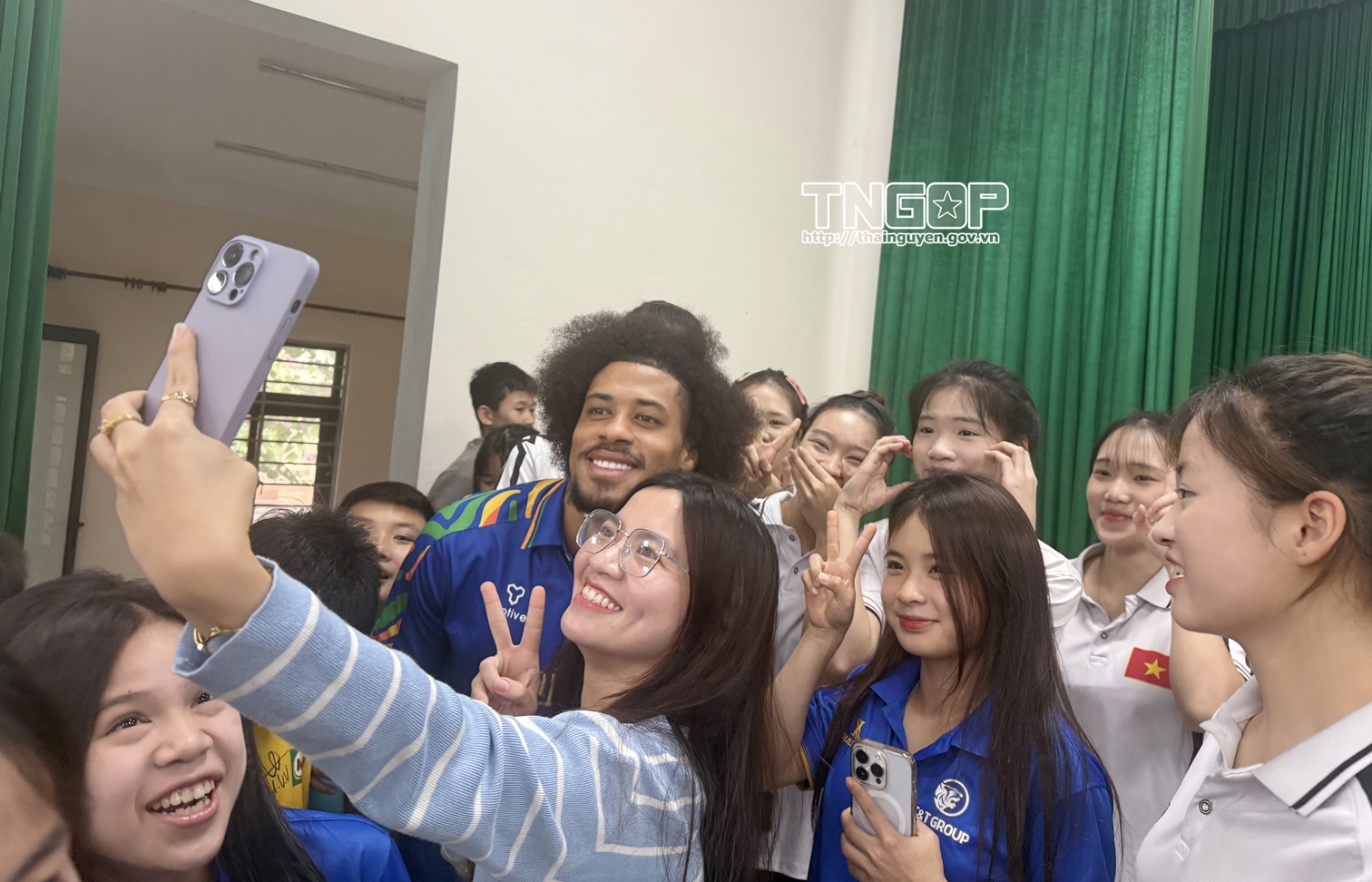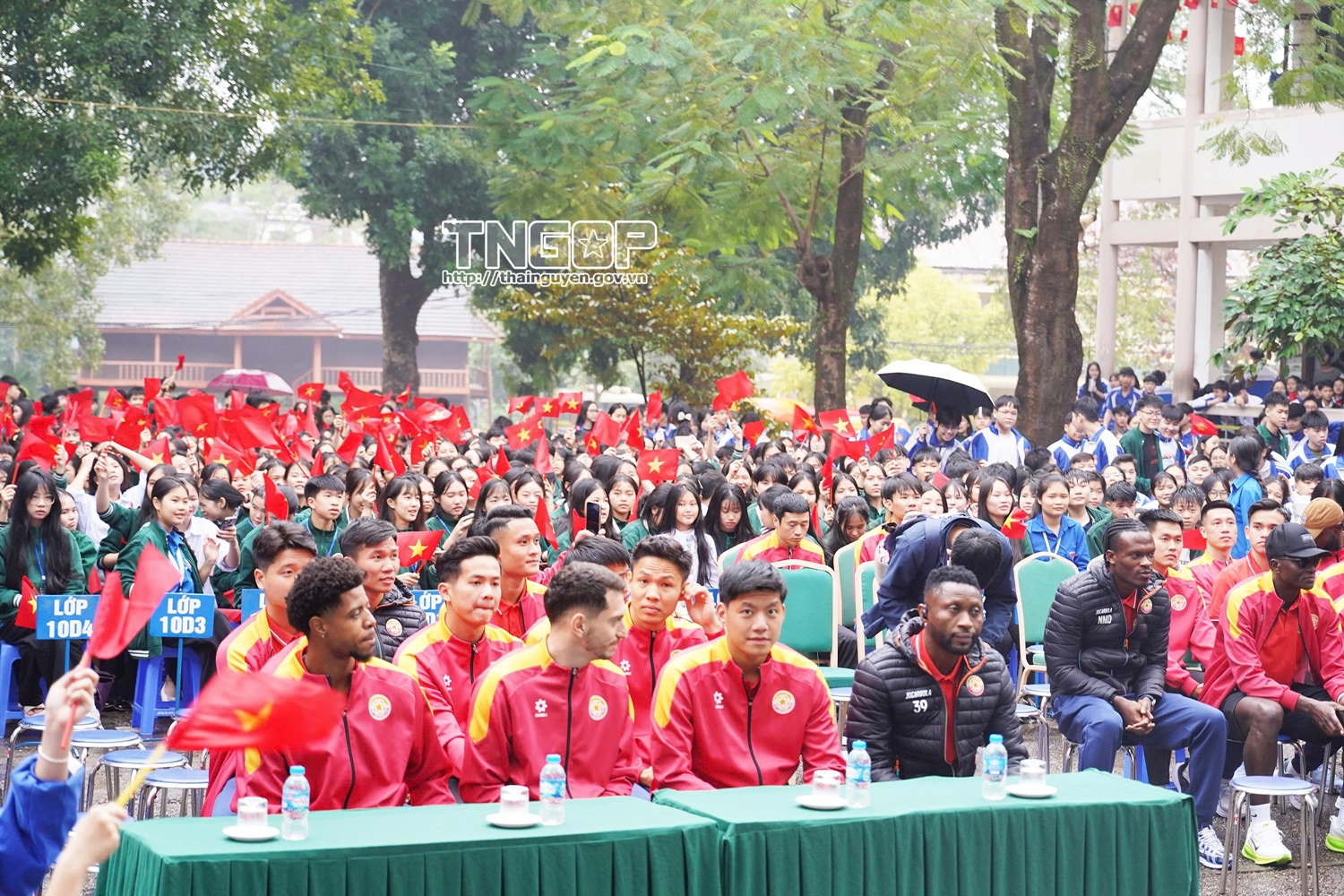 At Luong Ngoc Quyen High School, thousands of teachers and students participating in the exchange, autograph signing and taking commemorative photos with players of The Cong - Viettel FC