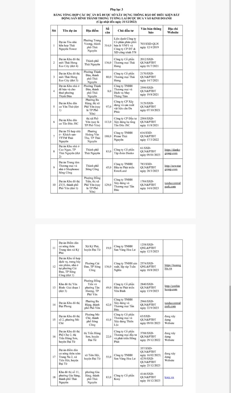 Sở Xây dựng công bố Danh sách các dự án đủ điều kiện bất động sản hình thành trong tương lai đưa vào kinh doanh cập nhật đến ngày 31/12/2023 (Phụ biểu 3).